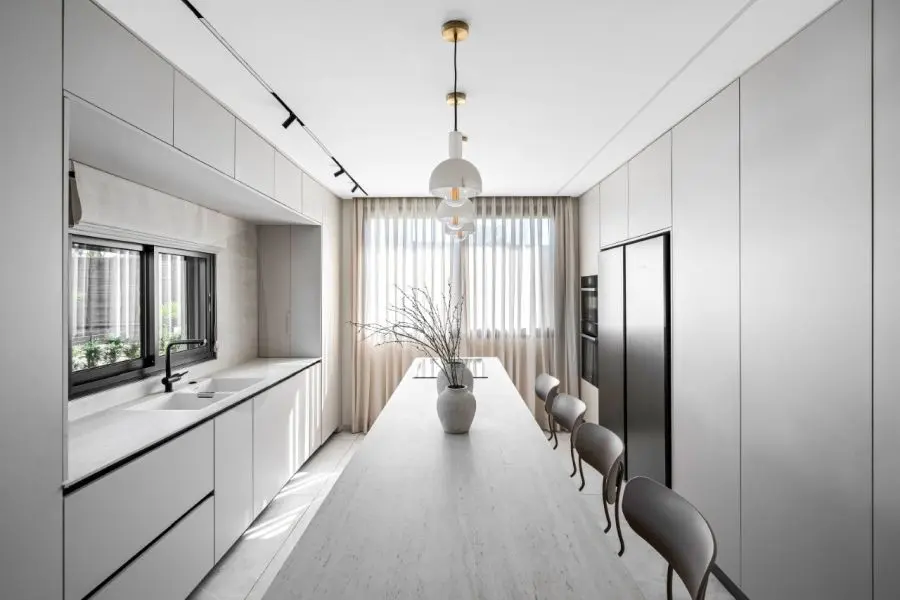 עוד מסבירות המעצבות "תכננו משטח עבודה רחב ומרווח, שיתאים לכל צורך יומיומי, ויאפשר גם לילדים לשהות בו בנוחות ובאופן עצמאי. הרעיון היה לשלב בין יופי לפונקציונליות: מצד אחד, עיצוב ראווה, מרשים ומזמין, ומצד שני, הצנעת האזורים שמרבים להתלכלך ולהתפזר. מוצרי החשמל במטבח נמדדו מראש, ומקומם תוכנן כך שיהיו נגישים אך גם מוסתרים, כדי לשמור על אסתטיקה וארגון לאורך כל היום. המטבח לא רק משדר יוקרה, אלא גם מציע פתרונות פרקטיים, ונשאר מסודר, נקי ומאורגן, תוך שמירה על אווירה ביתית וחמימה".